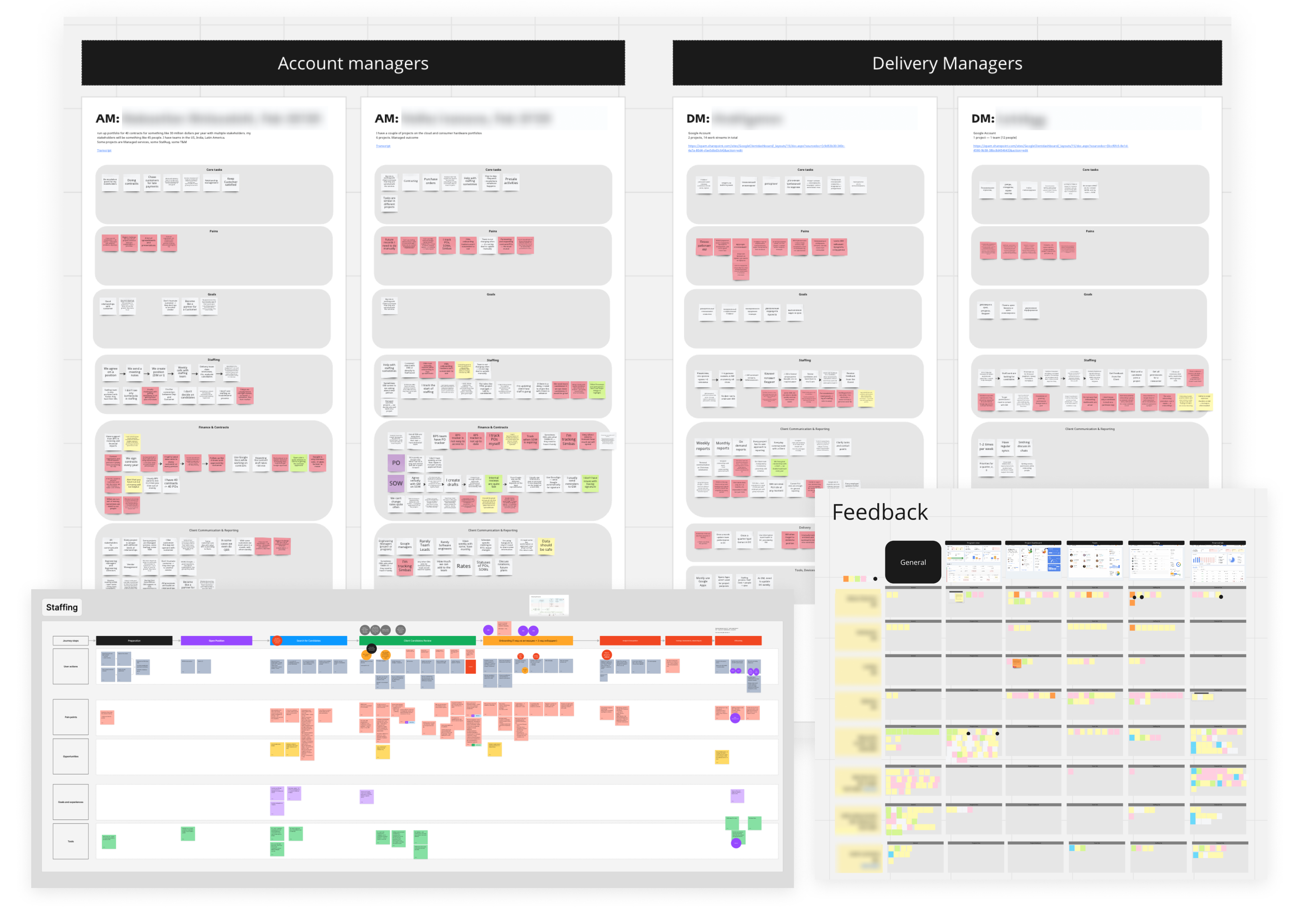 After identifying the most critical problem areas from a business perspective, I conducted 12 interviews with internal roles closely connected to client work.